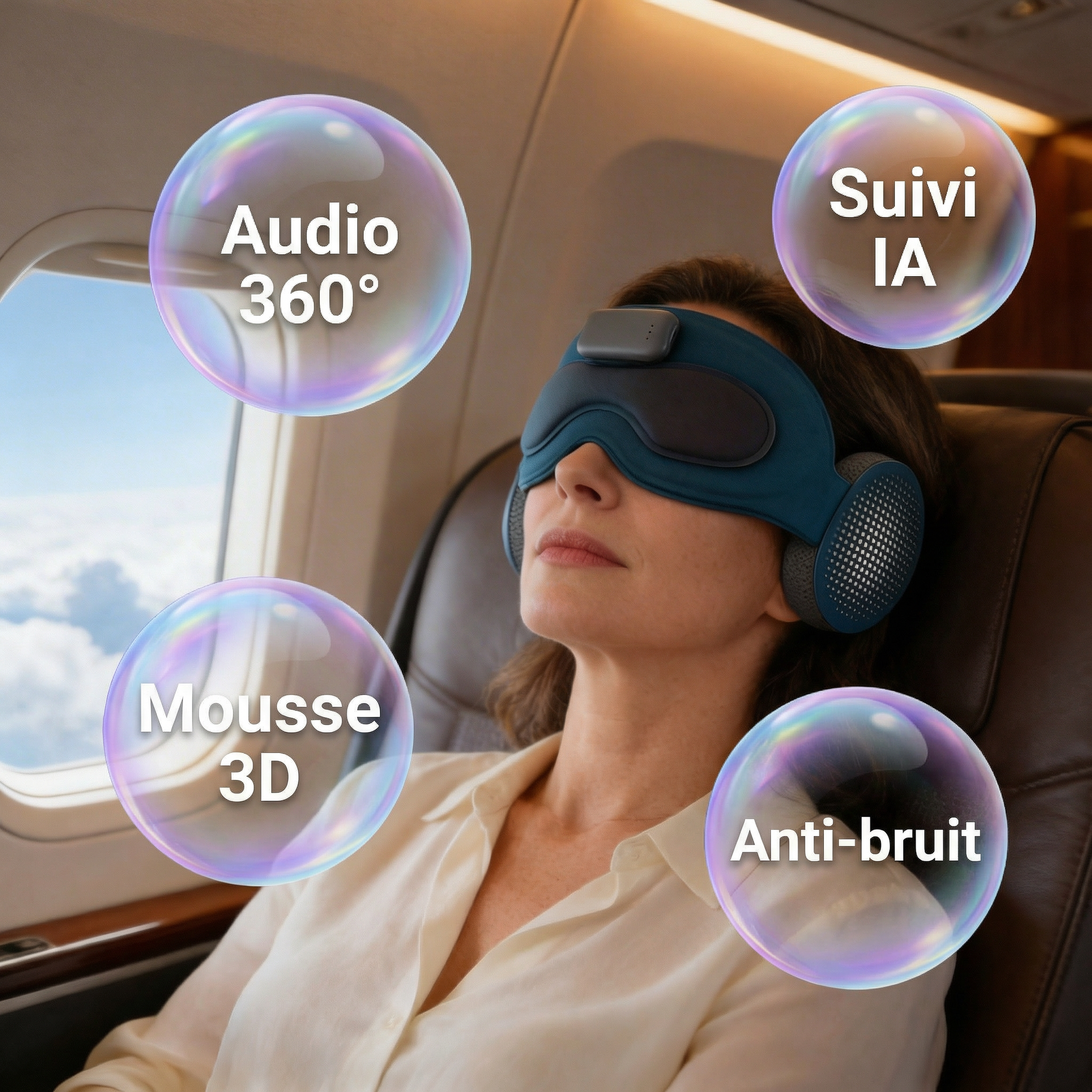 Haut-parleurs intégrés sans pression sur les oreilles. Bruit blanc, méditation, sons de la nature — votre ambiance idéale pour vous endormir.